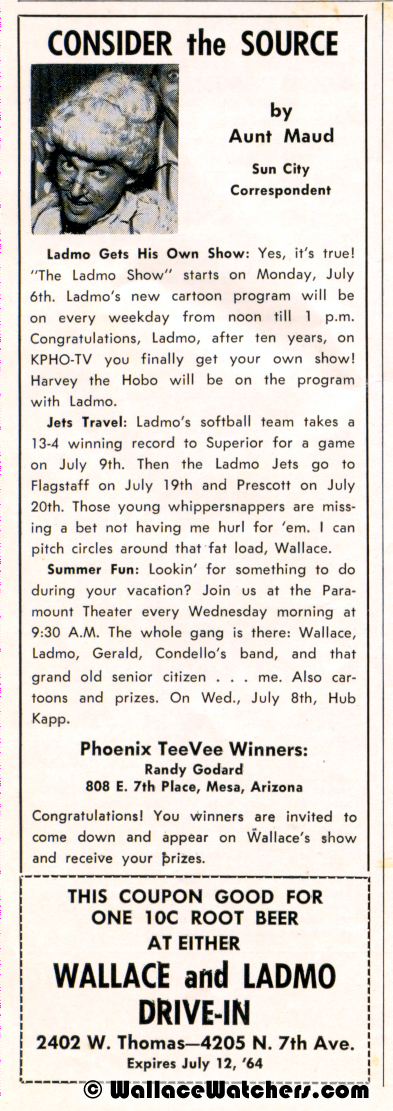 In the summer of 1964 after my freshman year at ASU (I lived in Phoenix from 1963 to 1976) I worked at KPHO-TV as a floor crewman, mostly running the mike boom for the Marge Condon Show and Wallace and Ladmo Show. In the latter, all kinds of fun went on too during the commercial breaks, as you may imagine... One of Wallace's gags on me was to make a sudden lunge for the boom mike and pull it into on-air view; I got pretty good at anticipating him and yanking it away just enough just in time. In one commercial break I made some crack about a new Ladmo allied with Gerald. Instantly (just time to put on a Ladmo costume), Bill, Lad and Pat McMahon put me into the show and someone else took over the mike boom. I (all of us) totally winged it... the new Ladmo was trying to teach children about science and arachnids and such. This continued for about three days and Wallboy put the audience to a vote for the old vs. new Ladmo. The kids across the street from me told all their friends who told all theirs, and there was actually a vote of something like 50 for the new Ladmo, of course totally overwhelmed by the vote for the real Ladmo. I still have a photo taken then of Lad and me in our Ladmo outfits. During one of our "winged" skits where I was carrying on about encyclopedias or some such thing, Richard Rawls, the station manager (who had originally hired me), came in and was having the hardest time to keep from laughing out loud. I seem to recall that there was another show started about then called the Harvey Trundle Show, where Harvey was a hobo. Wallace and Ladmo were also involved. There were more boom-mike-grabbing attempts... it was a unique, wonderful time and I'm delighted to have been in a small way involved. Once that summer I played the theater pipe organ in the Orpheum, now Palace West, for a live W & L stage show. WARMEST WISHES to all!!! ...Remember Jack Ross and Acquanetta, also Channel 5 staples?